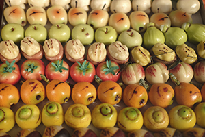 “Marzapane” is a sweet treat with a very distinctive consistency, done with almond paste, egg whites and sugar. The Sicilian version is called “Frutta di Martorana” and it is acknowledged as Italian traditional agricultural food products from the Sicilian region, usually it is prepared for the ceremonial of commemorating of the dead.