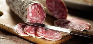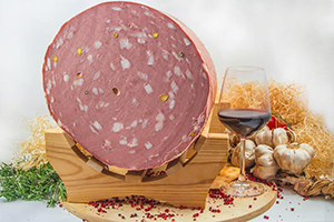 It is a large Italian cured-meat made of cooked pork meat and mixed with pork fat. Generally in cylindrical or oval shape. Traditionally seasoned with black pepper, and pistachio. The most known version is the Bolognese Mortadella.