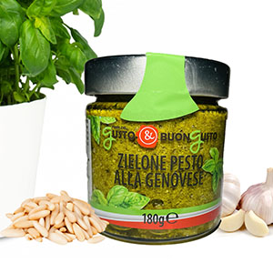 It is made by Compacting (mixing at high pressure) the basil with salt, pine nuts and the garlic. Then it is enriched with Parmigiano Reggiano cheese, Fiore Sardo cheese and “Extravergine” olive oil. It is a raw sauce, a compound of ingredients mixed being cold, uncooked making ingredients not to lose their original qualities.